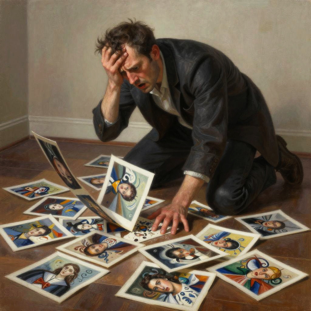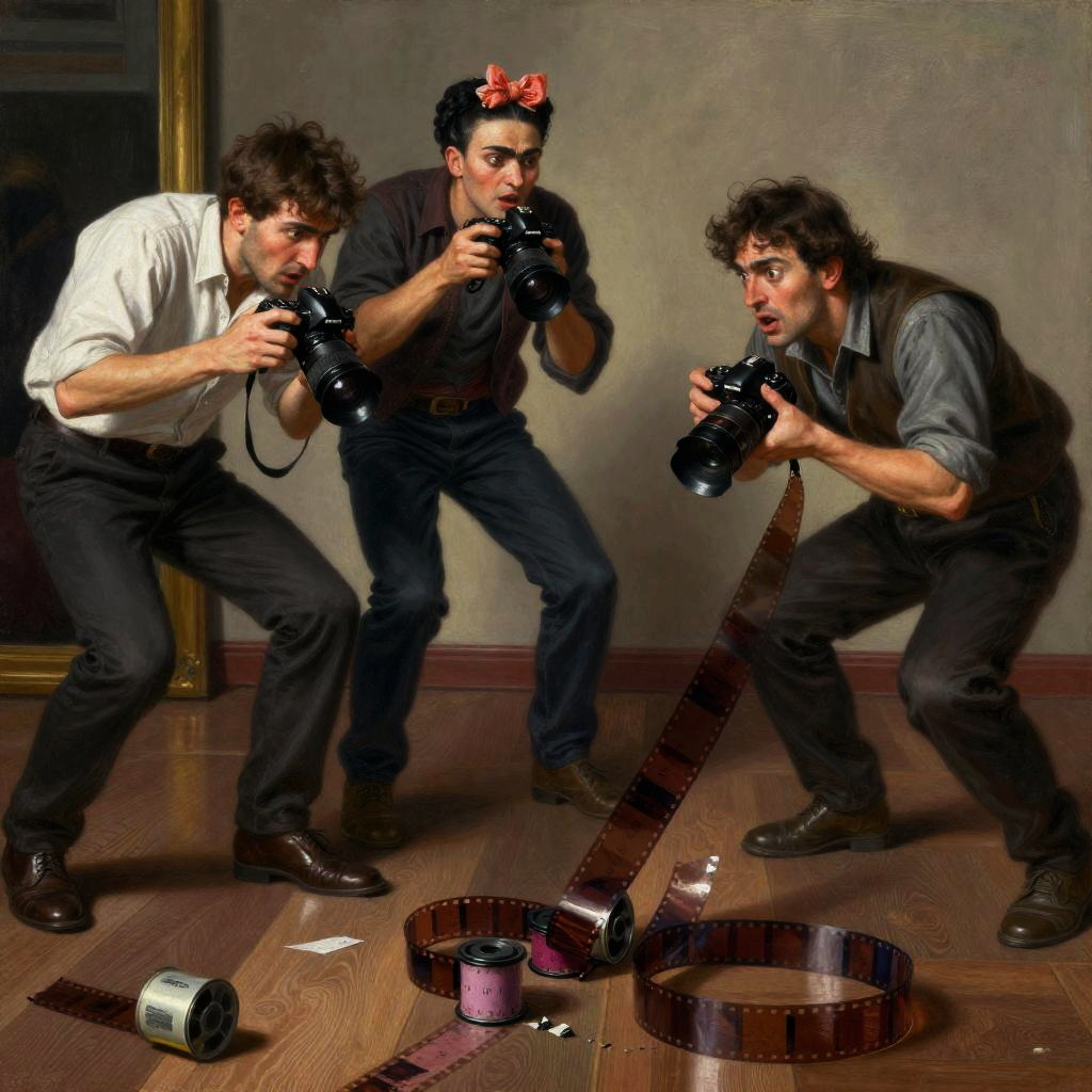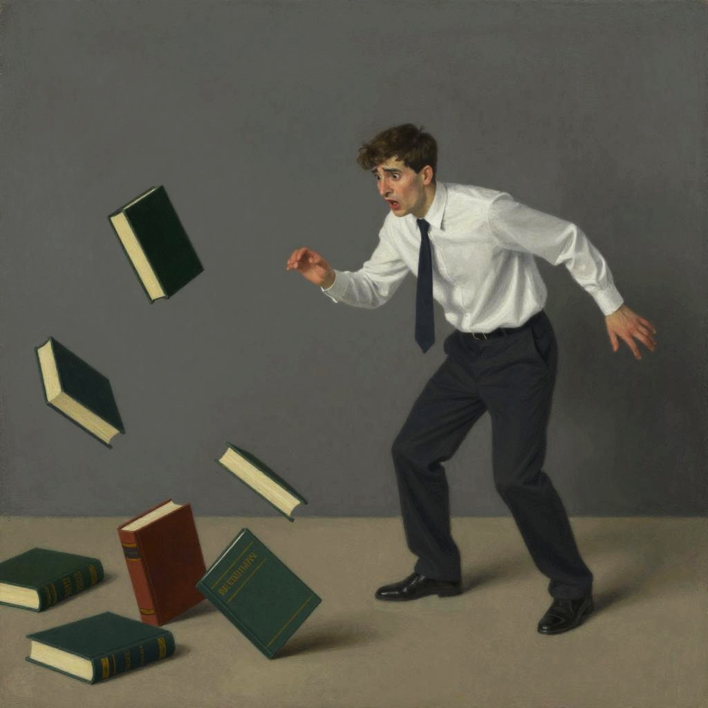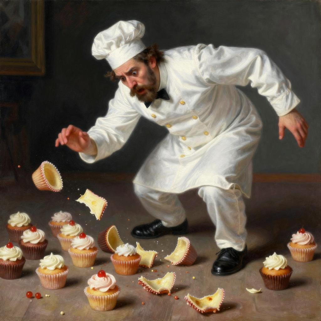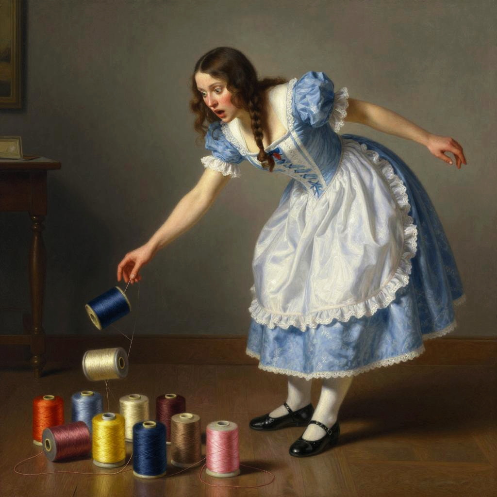 Nervous seamstress trips and looks in terror as he drops all the spools of thread on the floor, the spools of thread falls slice by slice, tragedy, intricate, elegant, highly detailed, lighting, painting, artstation, smooth, illustration, art by Leonardo da Vinci, Mary Blair