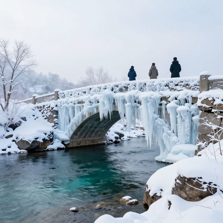 Frozen icicles cascade gracefully from a snow-covered stone bridge as three figures stand atop, gazing into a serene winter landscape where a tranquil turquoise river winds through rocky banks under a soft, misty sky.