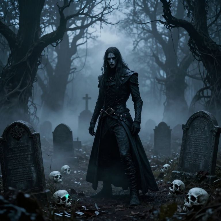 Digital artwork depicting a menacing, tall figure with long, disheveled black hair, standing in a foggy, blue-toned graveyard. The figure wears a dark, tattered, long coat and leather gloves, with a belt around the waist. Surrounding him are old, weathered gravestones and scattered white skulls with glowing green eyes. Leafless, twisted trees frame the background, adding to the eerie atmosphere. The ground is covered in dark, wet leaves, enhancing the ominous, supernatural setting. The overall mood is dark, foreboding, and hauntingly atmospheric.