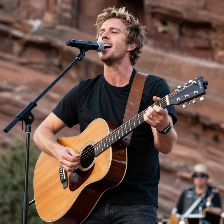 Nathaniel Rateliff performs passionately on stage at Red Rocks Amphitheater, strumming an acoustic guitar while singing into a microphone positioned above his head.
