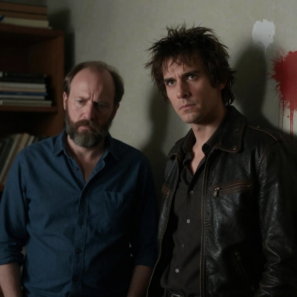 Two men in a dimly lit, cluttered garage. The man on the left has dark curly hair, a beard, and wears a black jacket over a dark shirt with black pants, holding a plastic bag and a black fur piece. The man on the right has short, messy hair, a tan jumpsuit, and holds a large gun. Background includes a damaged car and scattered debris. Both men have intense expressions.