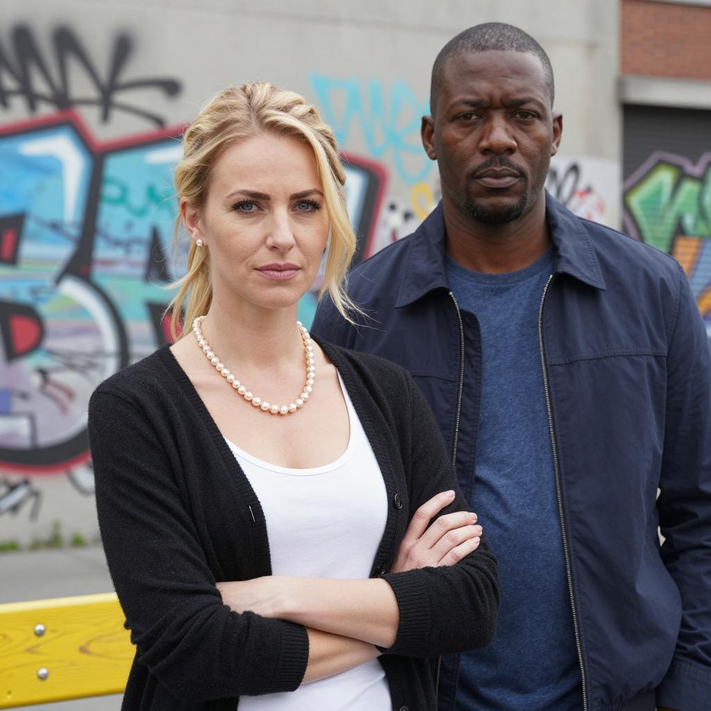 Portrait of a serious blonde woman and a black man standing outdoors in an urban setting. The woman wears a black cardigan, white top, and pearl necklace, with her arms crossed. The man is dressed in a dark blue jacket and blue shirt. They stand in front of a graffiti-covered wall with a yellow bench nearby.