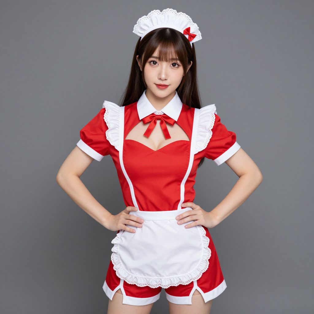 Red Waitress Costume, woman in red and white uniform posing for a picture