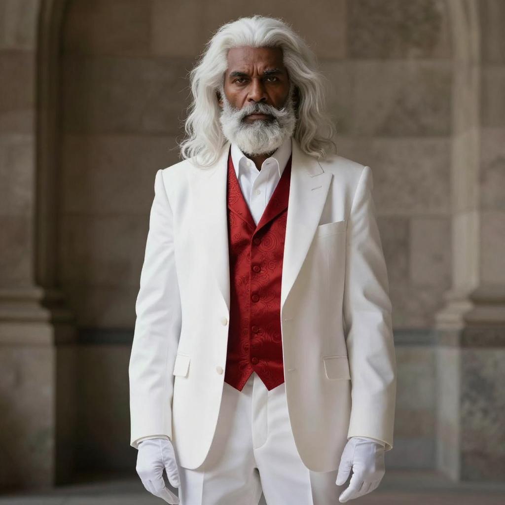A CGI image of a man with a wild white mane, white beard, and dark skin. He's wearing a white suit with a red, patterned vest, white shirt, and red shoes. His white gloves match his outfit. He stands against a stone wall, looking directly at the camera with a serious expression. The lighting highlights the textures of his hair and clothing.