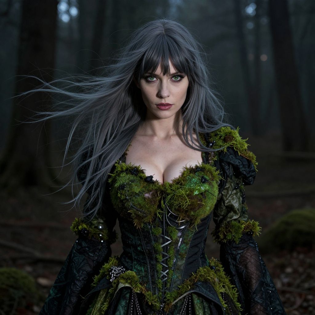 A serious woman with flowing gray hair and bangs that frame her face tightly stands in a dark forest clearing, wearing a hauntingly beautiful witch-themed costume made of moss green and black fabric, her intense green eyes focused on the shadows, under a foggy twilight sky.. The woman has big breasts and cute face