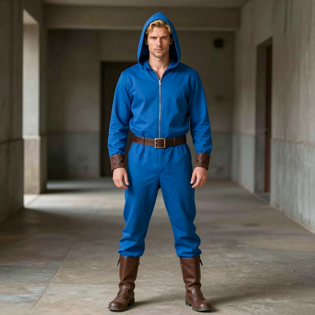 Blue pants costume, photograph of a man standing in a dimly lit corridor, wearing a blue hooded jumpsuit with a brown belt, brown boots, long sleeves, and brown cuffs, serious expression, blond hair peeking from under the hood, background shows concrete walls and pillars, realistic style, slightly blurred background, casual, medieval or fantasy-inspired outfit, full body, centered, medium shot