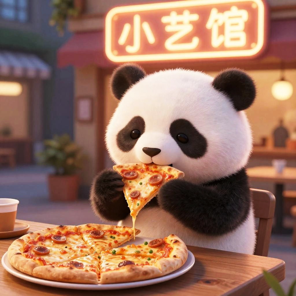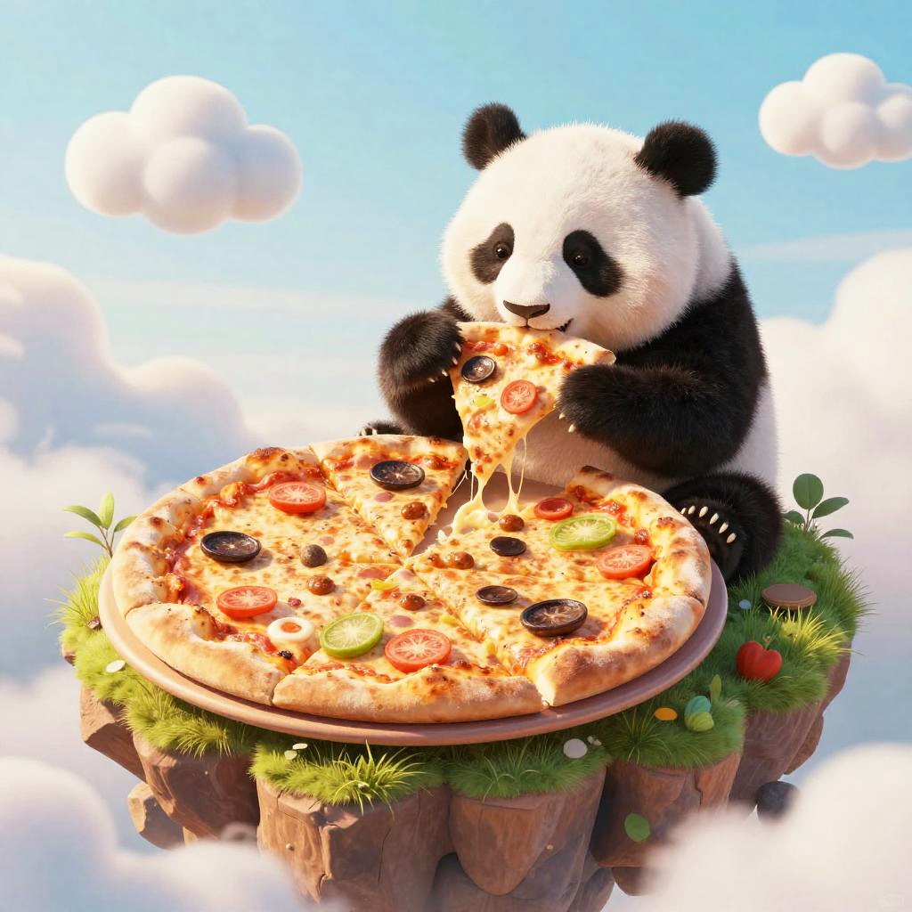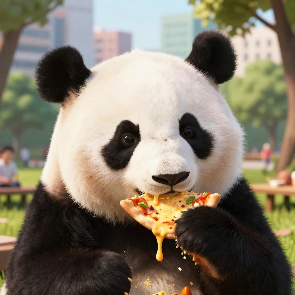 Close-up of a panda eating pizza, messy cheese and toppings on its face, expressive eyes, urban park background with blurred trees and picnic elements, realistic yet playful illustration