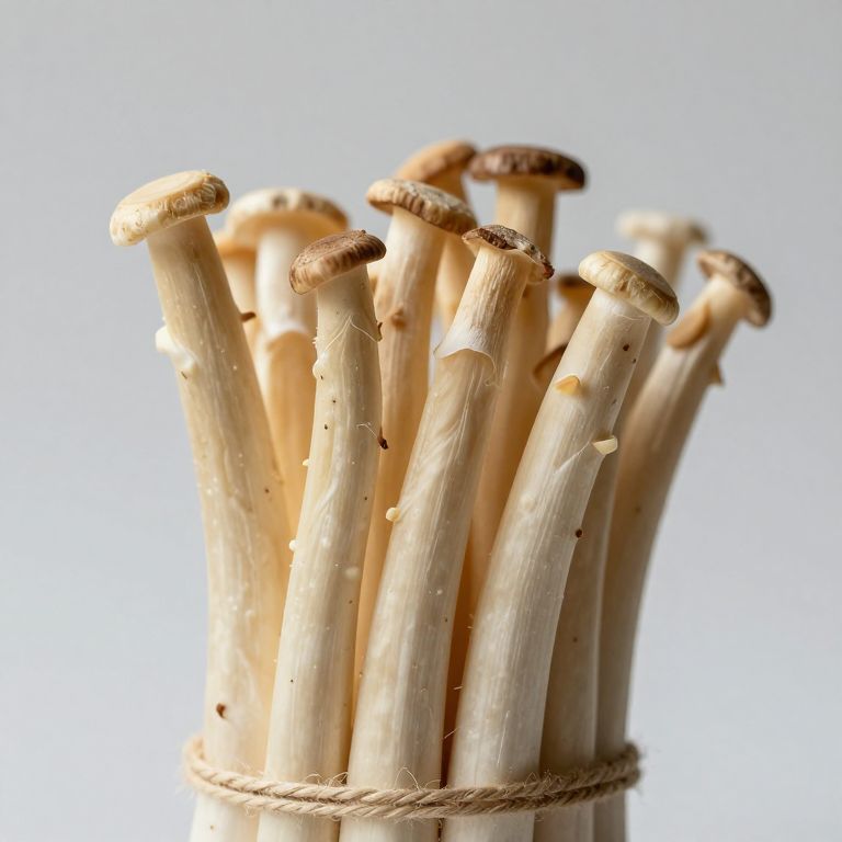 Photograph of a bundle of mushroom stems, tightly bound with a thin, brown rope at the base. The stems are light beige with subtle, natural textures and small, scattered black specks. The mushroom caps are missing, revealing the smooth, cylindrical tops. The background is a clean, gradient white to light gray, emphasizing the mushrooms' natural color and texture. The stems are arranged in a slightly fanned-out manner, creating a sense of depth and three-dimensionality. The lighting is bright and even, highlighting the mushrooms' organic, fresh appearance.