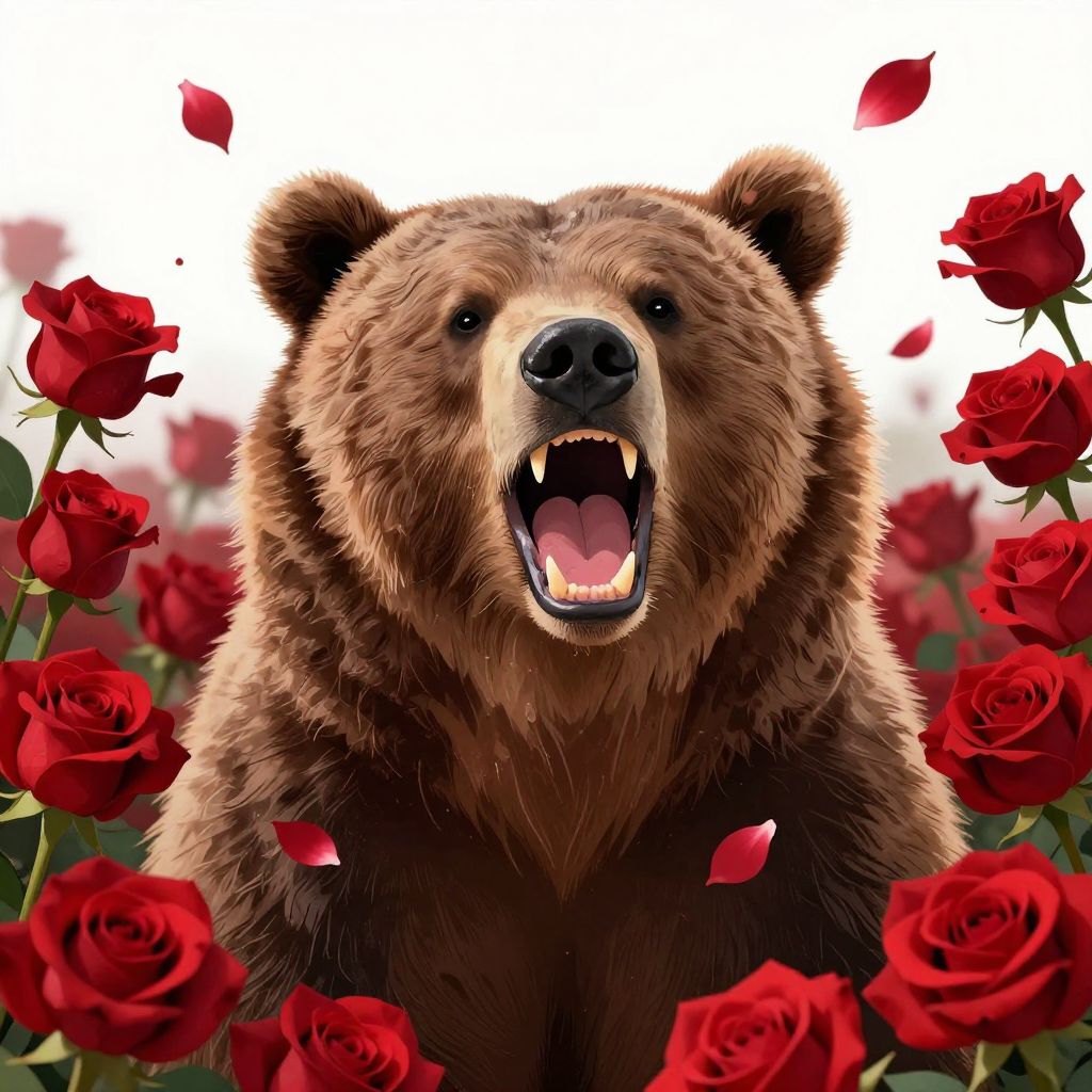Photorealistic digital illustration of a large brown bear with a wide-open mouth, revealing sharp teeth, surrounded by a dense field of vibrant red roses. The bear's fur is detailed with varying shades of brown, and its eyes are dark and focused. Red rose petals are scattered around, adding a dynamic element to the composition. The background is a bright, solid white, making the bear and roses stand out prominently. The bear's expression is fierce and intense, contrasting with the delicate, romantic appearance of the roses.