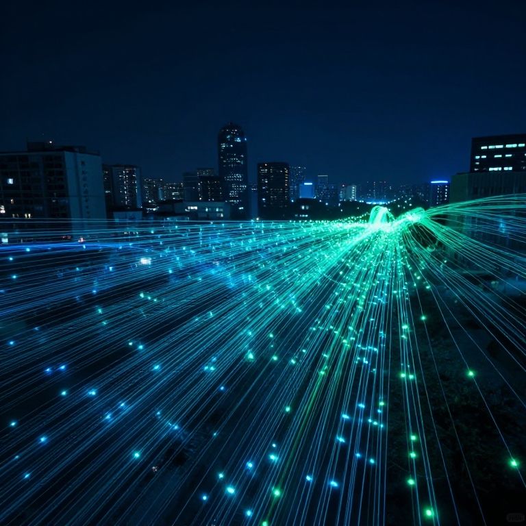 Conexion visualized as an intricate web of illuminated fiber optic cables spanning across a high-tech city skyline at night, neon blue and green lights pulsing along the cables, cyberpunk aesthetic conveying connectivity and data flow.