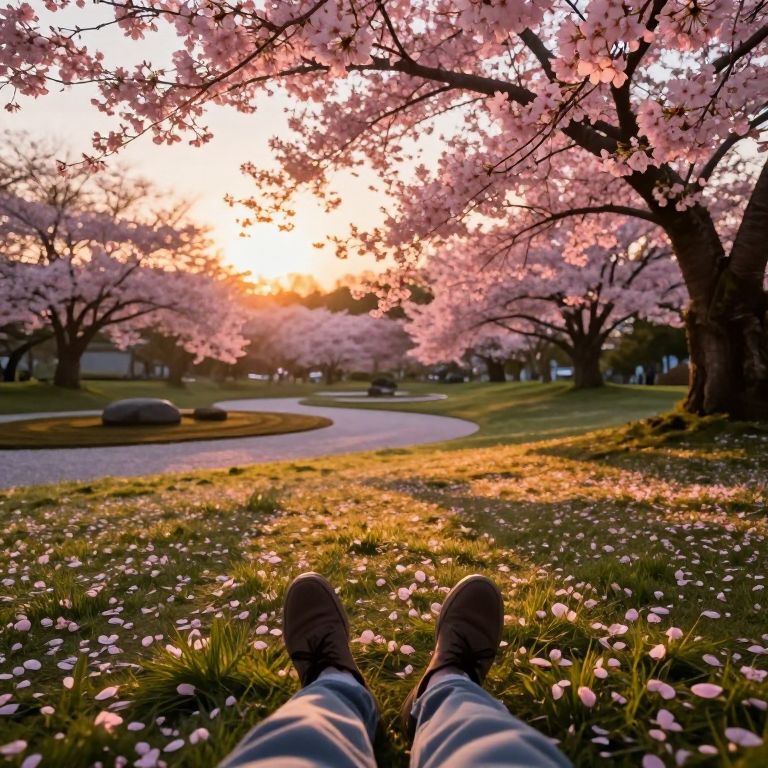 Imagine an idyllic Zen garden bathed in the gentle amber glow of sunset, as sunlight filters through blossoming cherry trees overhead. From a first-person perspective lying on the grass beneath these fleeting pink petals, one gazes upward at the captivating interplay of light and shadow across this tranquil landscape. This digital artwork meticulously captures every detail of each petal and blade of grass, with colors shifting harmoniously from warm tones up close to cooler shades in the distance, crafting an emotional gradient that conveys a profound sense of serenity, contemplation, and reverence for nature's fleeting loveliness.