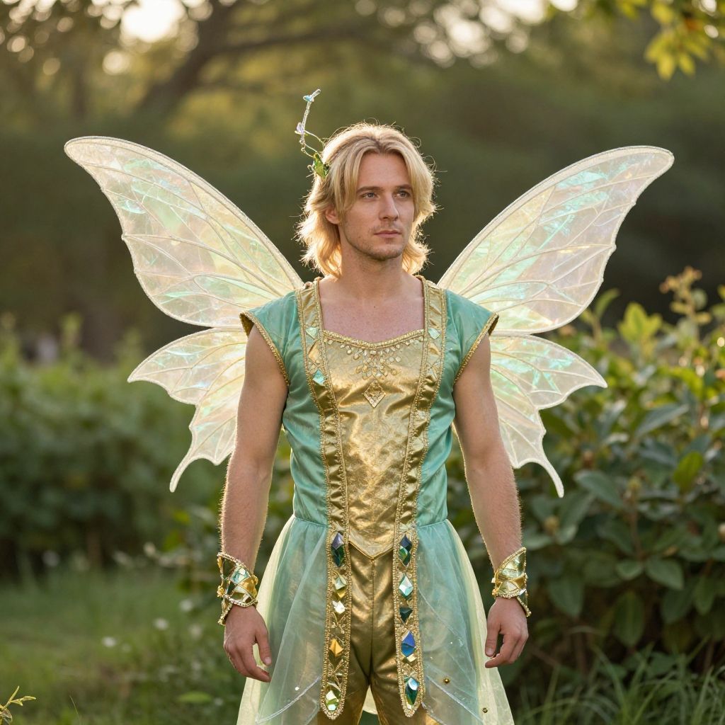 A man dressed in an elaborate fairy costume stands outdoors during the golden hour, surrounded by lush greenery. His green and gold outfit, complete with delicate fairy wings, captures a whimsical and photorealistic fantasy style portrait.