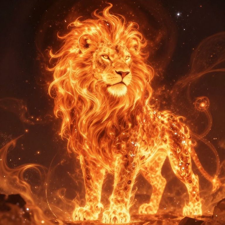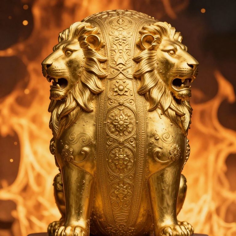 A golden seal featuring two lion heads with intricate designs and a fiery background.