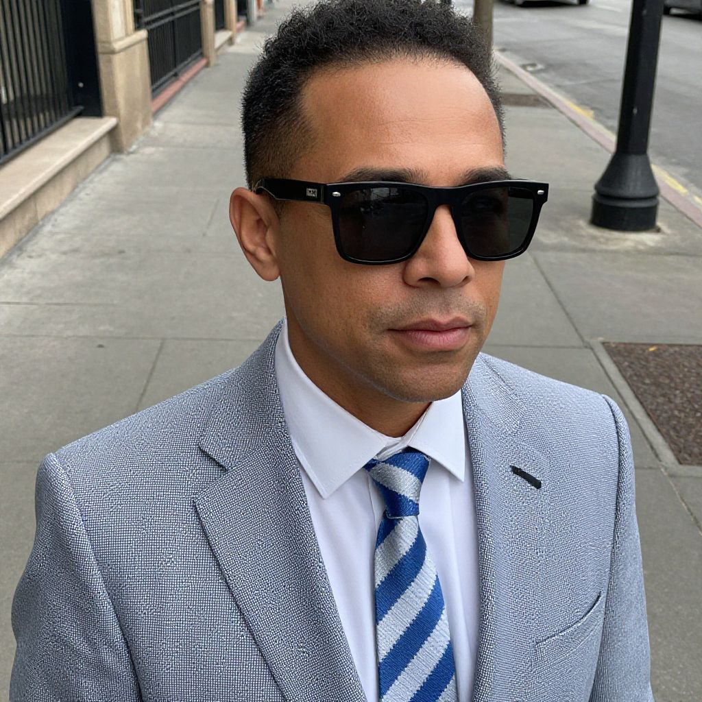 Photograph of a medium-built, light brown-skinned man with short black hair, wearing black, rectangular sunglasses and a gray herringbone-patterned suit jacket over a white dress shirt. He has a blue and white striped tie. He stands on a city sidewalk with a black lamppost and building with black iron bars in the background. The sidewalk is gray with a yellow line near the curb. He has a neutral expression and a slightly parted mouth. The image has a slight digital enhancement effect, making the colors and textures more vivid.