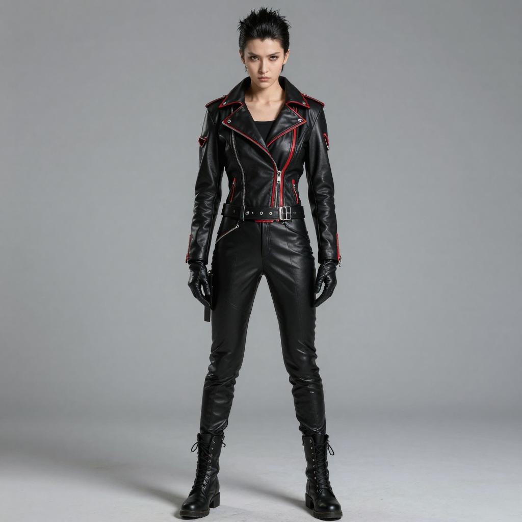 Photograph of a woman in a black leather suit standing on a geometric, illuminated floor. She holds a gun with both hands, aiming forward. Background includes bright white walls and a circular red and black symbol. She has short black hair and a focused expression. The floor has red and white triangular patterns. She stands at the center with a symmetrical, angular layout behind her.