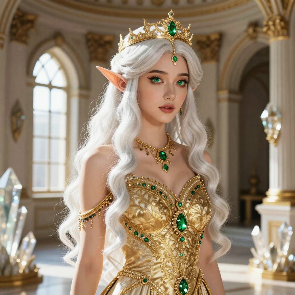 High elf female art showcasing a regal elf queen with emerald green eyes and flowing white hair, wearing ornate golden robes, standing in an ancient enchanted castle with floating crystals and luminous flora, fantasy realism with magical ambiance.
