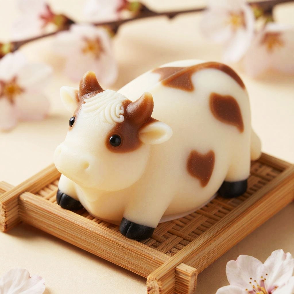 Moocake delicately shaped like a plump cow, featuring smooth white and brown marbled patterns, resting on a traditional bamboo tray surrounded by soft cherry blossoms, warm natural lighting highlighting its glossy texture, realistic food photography style.