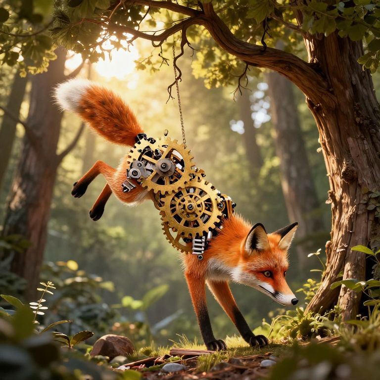A clockwork fox, gears whirring in golden daylight, navigates a forest where every tree grows upside-down with roots reaching for the sun.