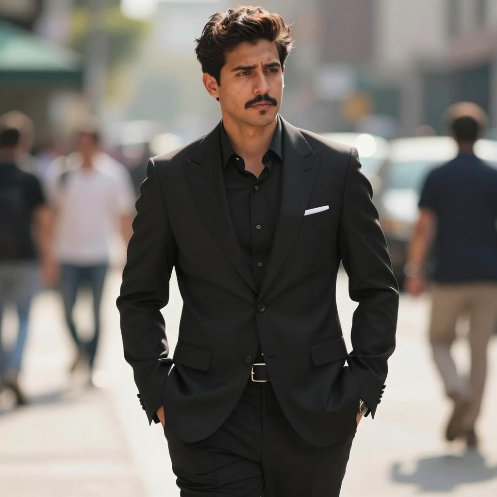 Photo of a handsome man with dark brown hair and a mustache wearing a sharp black suit with a white pocket square and a black shirt. He has a serious expression and his hands are in his pockets. The man is walking outdoors in an urban setting during daytime with blurred people and traffic in the background. Warm sunlight highlights his confident pose.