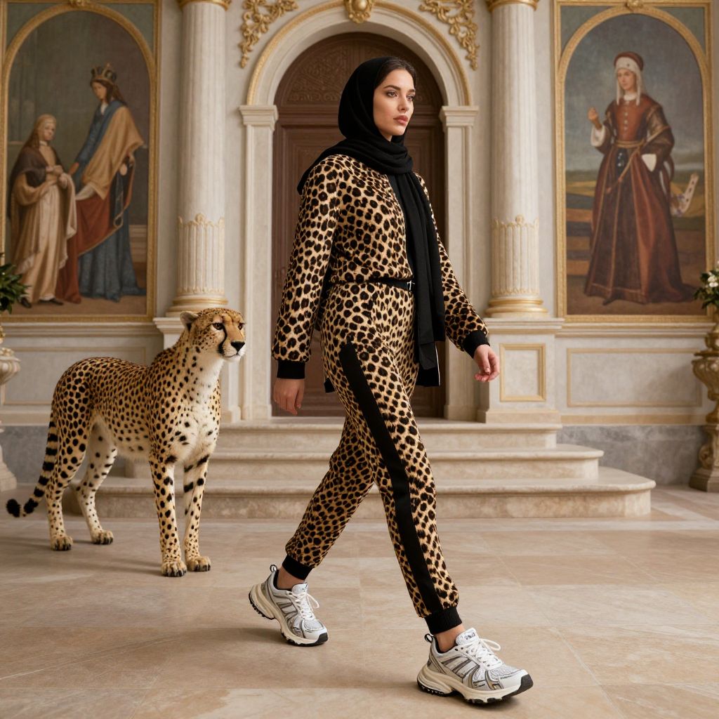A woman in a hijab and Balenciaga sneakers walks with a cheetah in a Renaissance-style villa, dressed in a leopard print outfit.