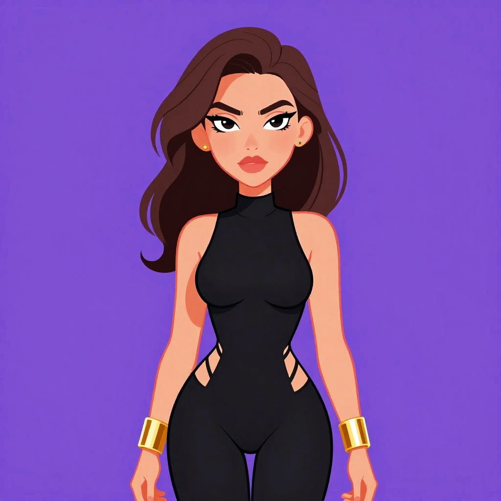 Woman with pretty face and pretty hair. Woman, edgy, black sleeveless bodysuit with side cut-outs and lace-up details, high neck, fitted silhouette, paired with gold cuff bracelets. --sref 1467