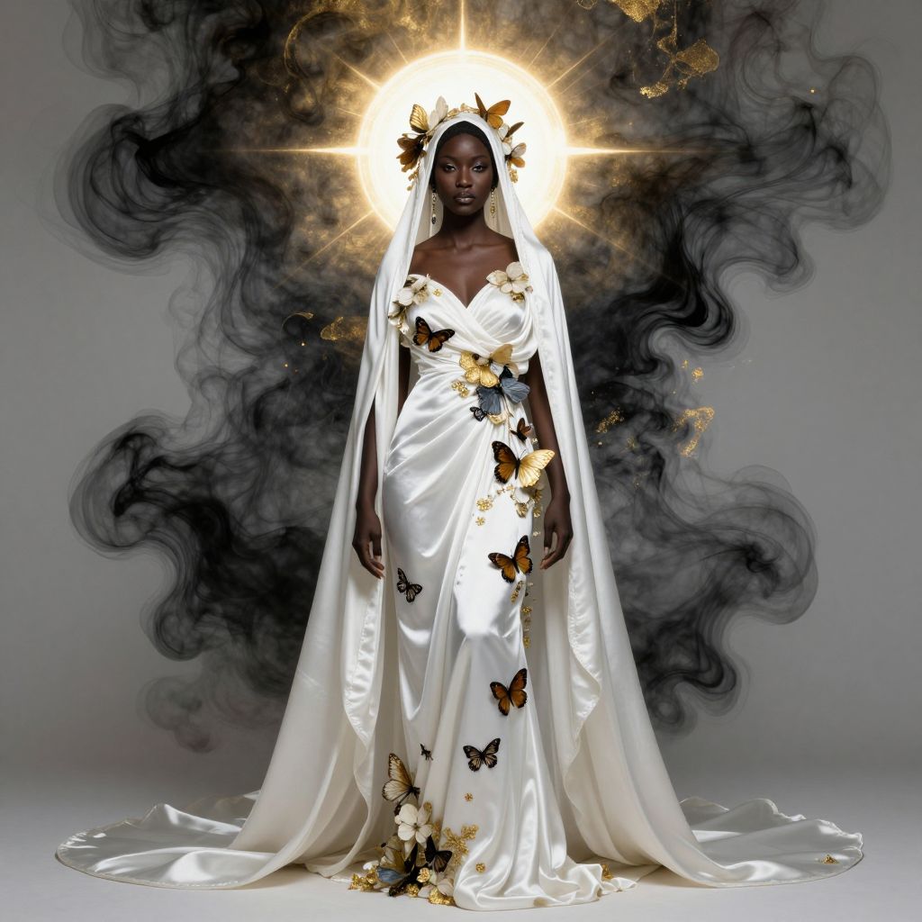 Beautiful ebony goddess cloaked in white silk, radiant halo of light, black gold smoke ink, woman covered in butterflies and flowers, peter mohrbacher, artgerm