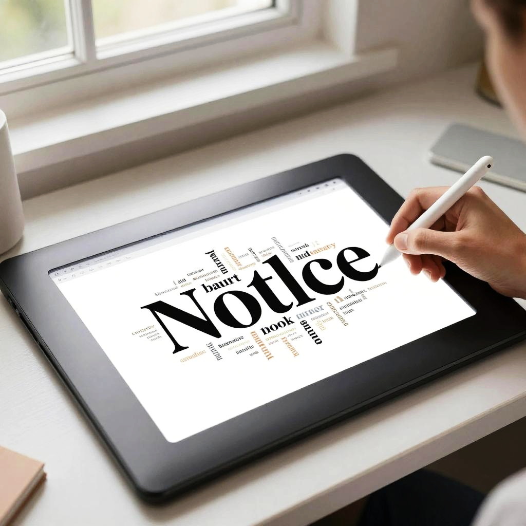 Word art maker online, elegant workspace featuring a designer crafting word clouds and typography art with a stylus on a graphic tablet, soft natural light streaming through window, minimalistic and sleek UI, creative and inspiring mood