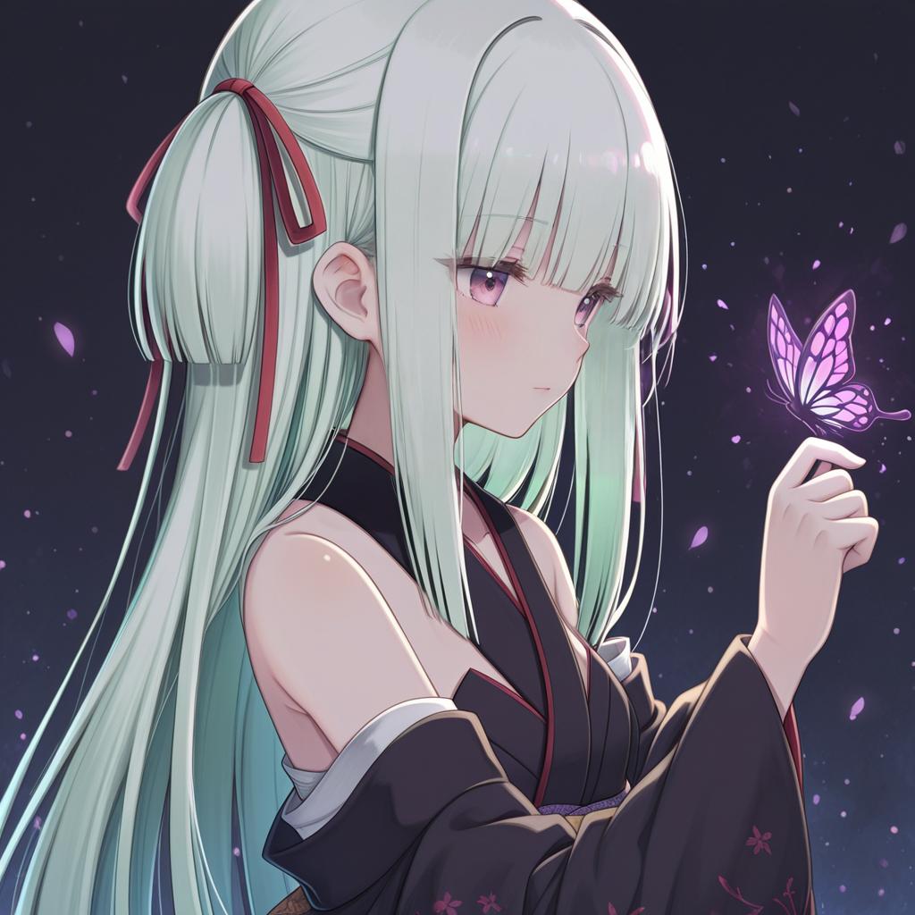 Digital anime-style drawing of a pale-skinned, young woman with long, white hair tied in a side ponytail with a red ribbon. She wears a black, off-shoulder kimono with white trim. Her large, pink eyes are focused on a glowing, purple butterfly she gently holds in her right hand. The background is a dark, starry night with scattered purple petals. Her expression is calm and slightly melancholic. The butterfly's wings are delicately detailed, adding a sense of magic to the scene. The overall composition is elegant and serene.