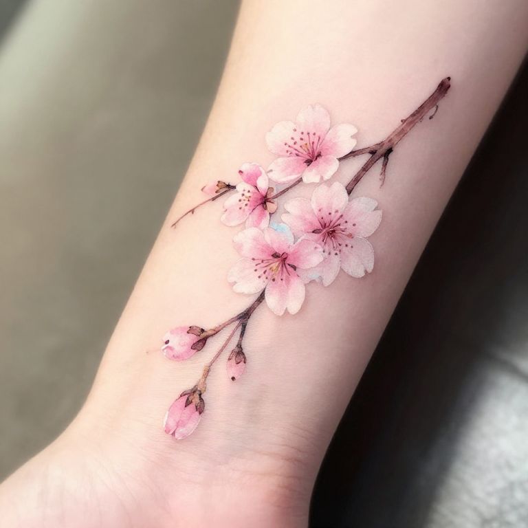 Create a tattoo design free online depicting a delicate watercolor-style cherry blossom branch with soft pastel pinks and light blues, flowing lines, realistic floral petals, subtle shadowing, harmonious and gentle look for wrist or ankle tattoos.