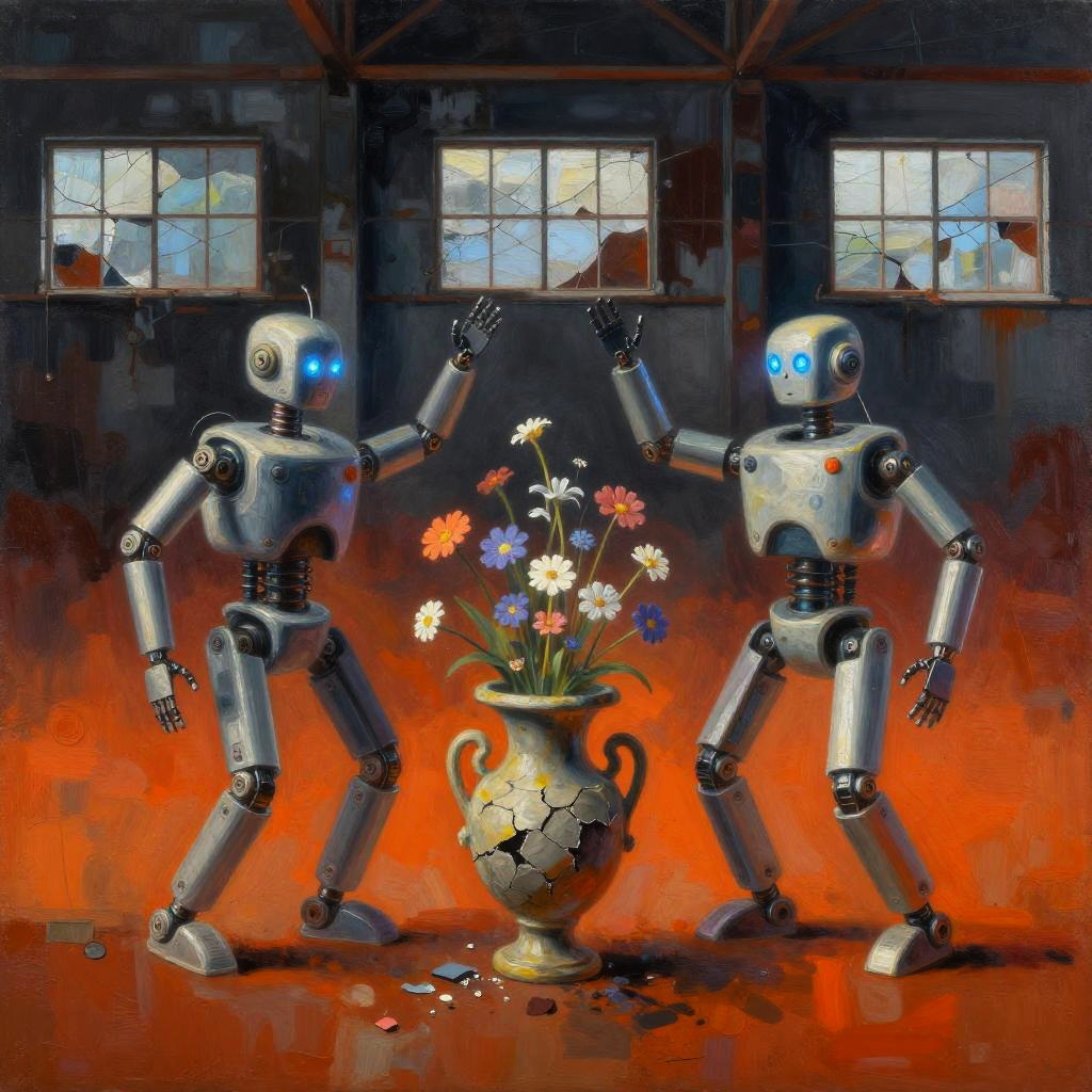 Abstract acrylic painting depicting two futuristic robots with glowing blue eyes dancing around a cracked urn filled with colorful wildflowers inside an abandoned industrial warehouse with cracked windows. The background transitions in a smooth gradient from deep charcoal to rusty orange. The artwork features a whimsical tone with refined composition, tactile detail, vibrant colors, soft rim lighting, and a balanced layout.