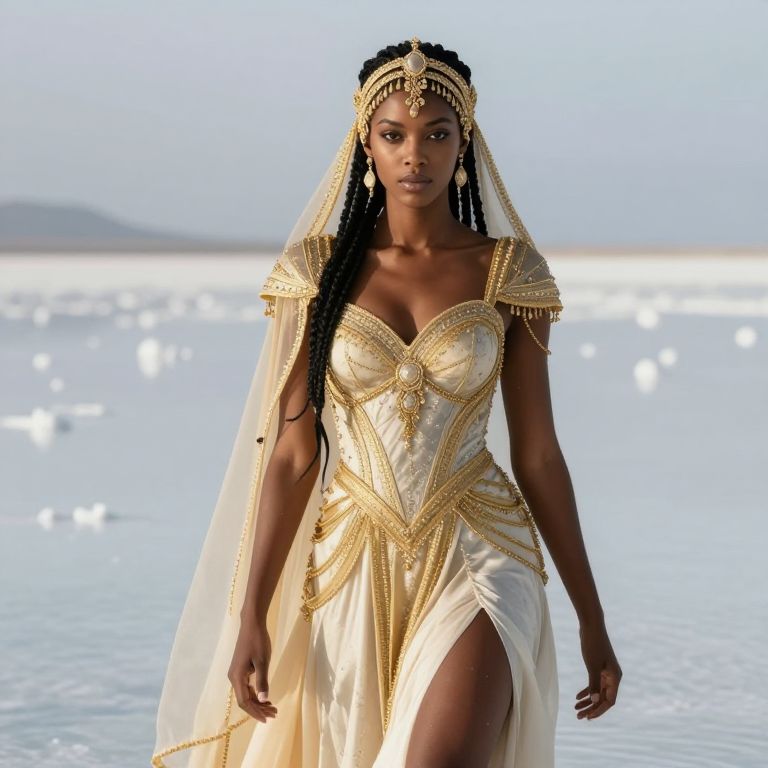 A close-up, glamorous portrait of a black goddess with braids, wearing a gold and white wedding dress with a traditional gold headdress and shoulder mantle, walking on water in the center of wet Salar de Uyuni, with a fierce gaze and a shallow depth of field.
