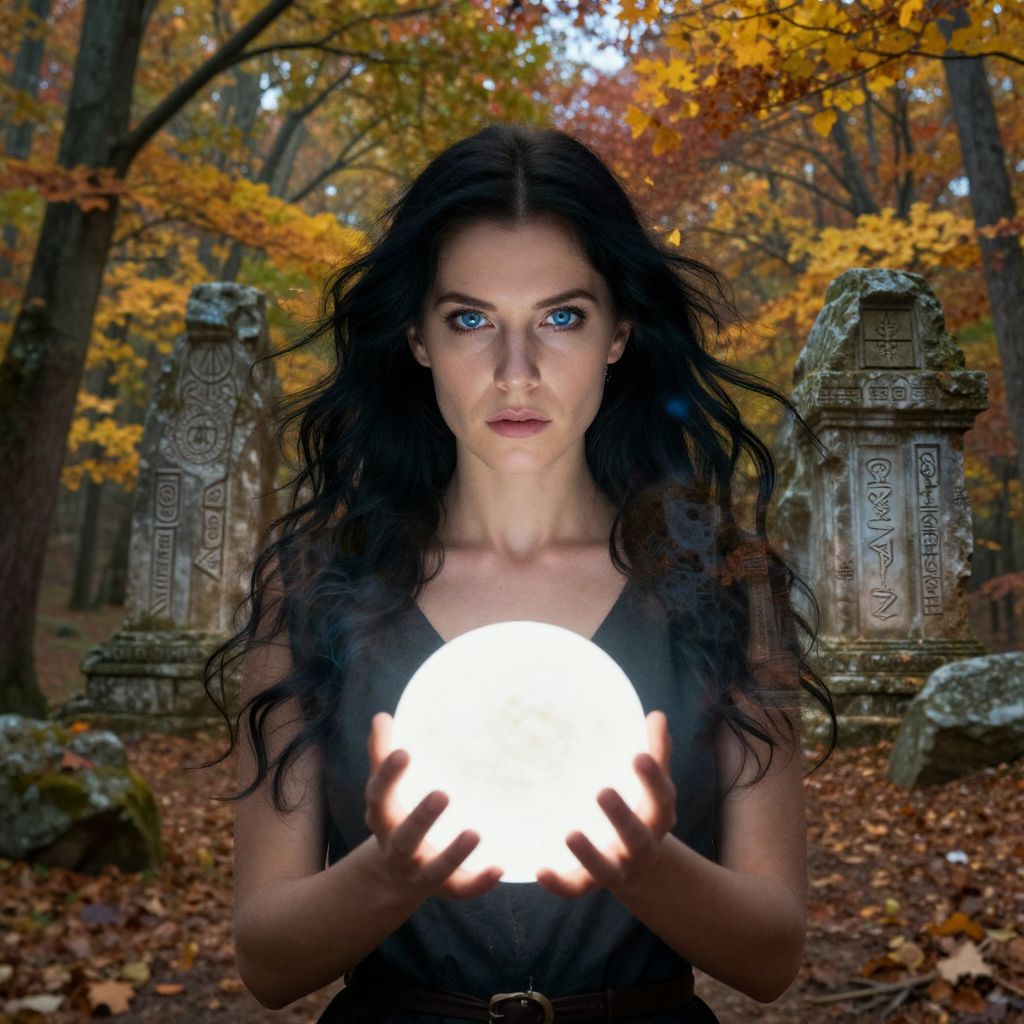 Photograph-like digital artwork of a pale-skinned, blue-eyed woman with long, wavy black hair, standing in a forest during autumn. She wears a black, sleeveless top and holds a glowing, white orb in her hands. Her intense gaze is directed at the viewer. Behind her, ancient stone statues and trees with vibrant orange and yellow leaves create a mystical, magical atmosphere. The forest floor is covered with fallen leaves, enhancing the autumnal setting. The lighting emphasizes the orb's brightness, contrasting with the darker, earthy tones of the background.