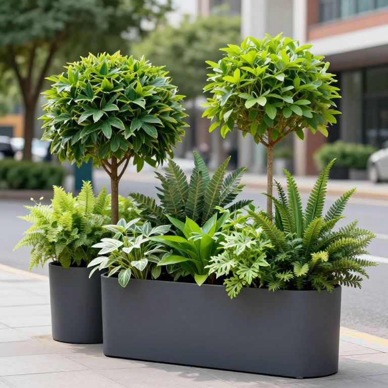 "Street Samurai planters in garden modern rectugulaire et cerculaire designs and ultra realistic lightfull plants green vivid colors,"