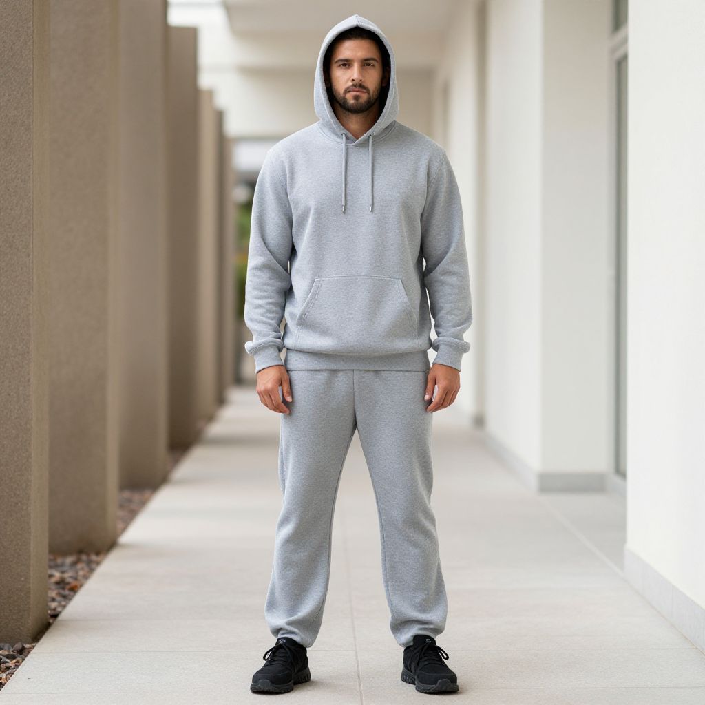 Thermal Pants Man Costume, man in a gray hoodie and sweatpants standing in a walkway