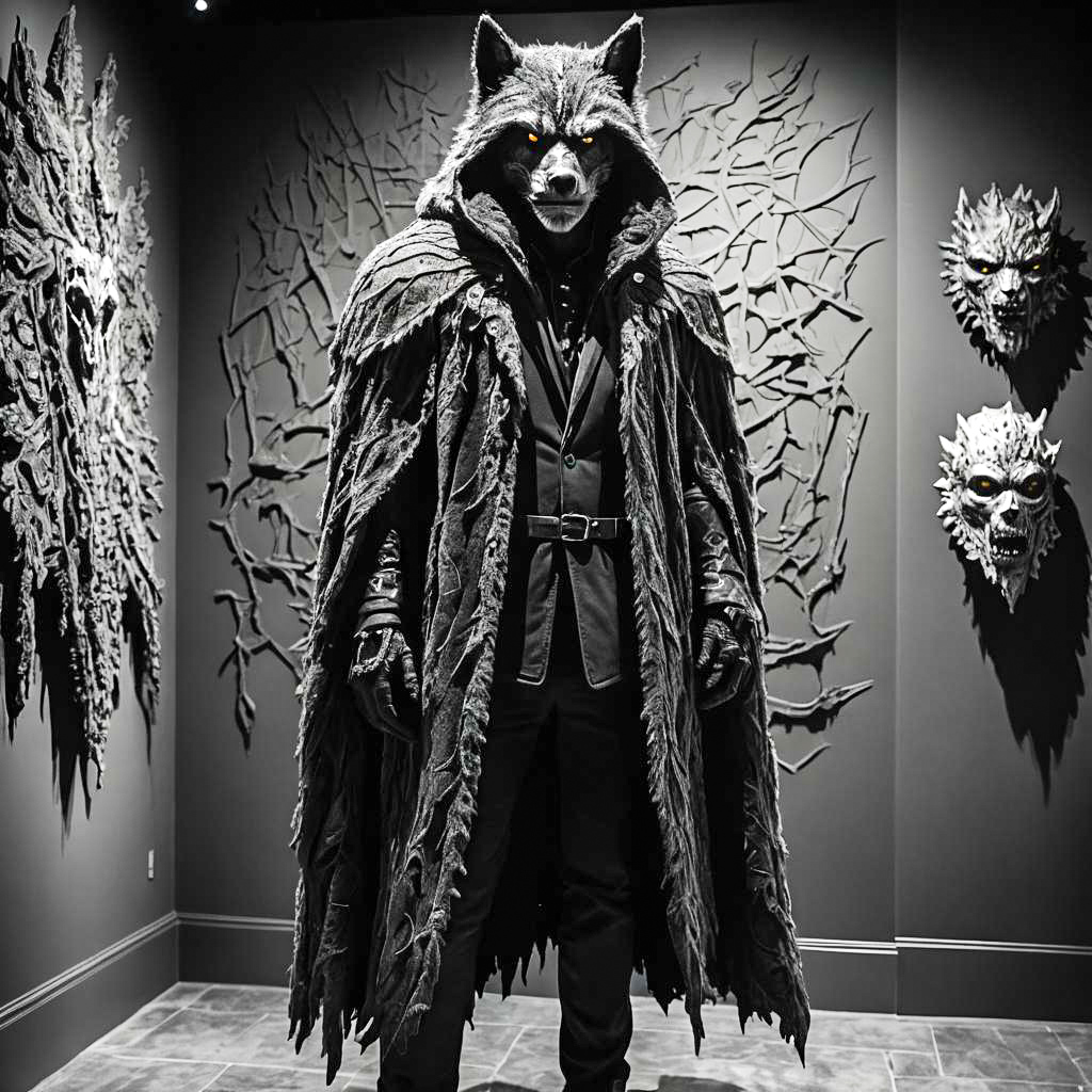 Halloween outfit, worn by stone werewolf, featuring jagged fur stitch patterned cloak, in grayscale with spotlight, captured in horror art exhibition setting.