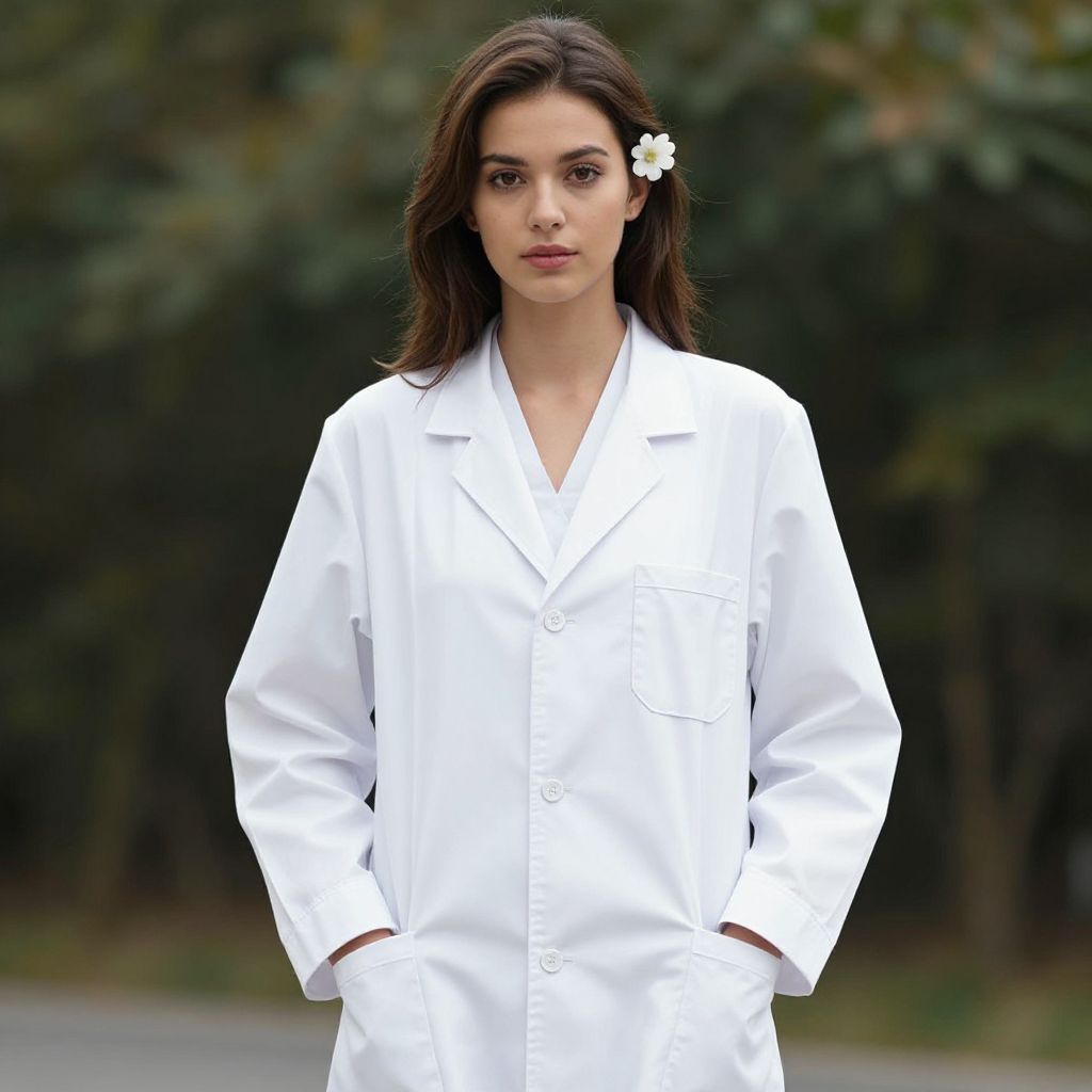 White coat outfit, 1girl, solo, flower, brown hair, hands in pockets, looking at viewer, lab coat, outdoors, brown eyes, coat, photo background, standing