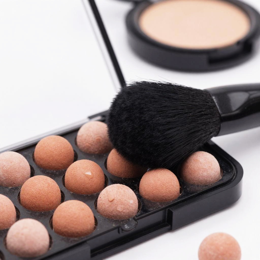 This is a close-up photo of an open black makeup palette filled with small, pinkish-orange powder balls. A large, black, fluffy brush is resting on top of the palette. In the background, there's a blurred view of a shiny gold and black makeup compact. The photo has a bright white background that makes the colors pop.