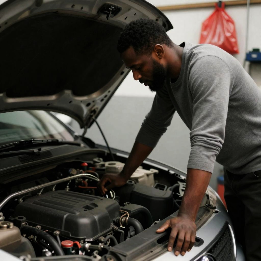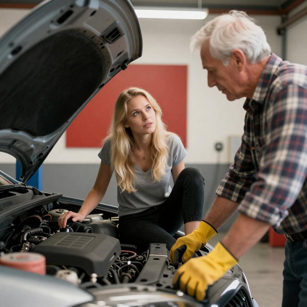 Photograph of a garage. Blonde woman with long hair, gray shirt, and black pants, sitting on car, looking up at older man with white hair, plaid shirt, and yellow gloves, working on car engine. Red wall art in background.