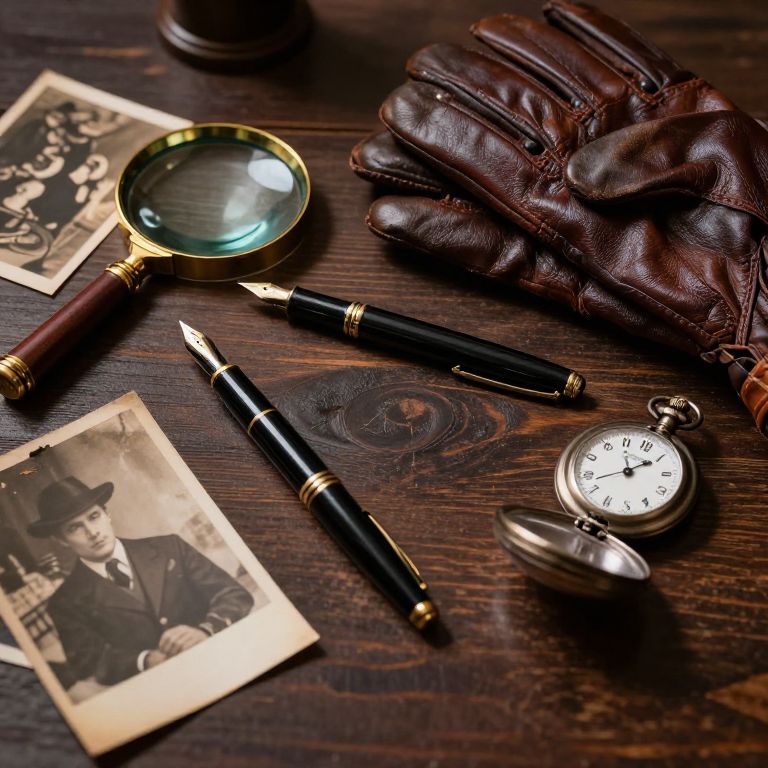 Vintage detective paraphernalia arranged meticulously on a dark wooden table, including magnifying glass, old leather gloves, a fountain pen, a pocket watch, and faded photographs, evoking a noir mood with dramatic shadows and a retro aesthetic.
