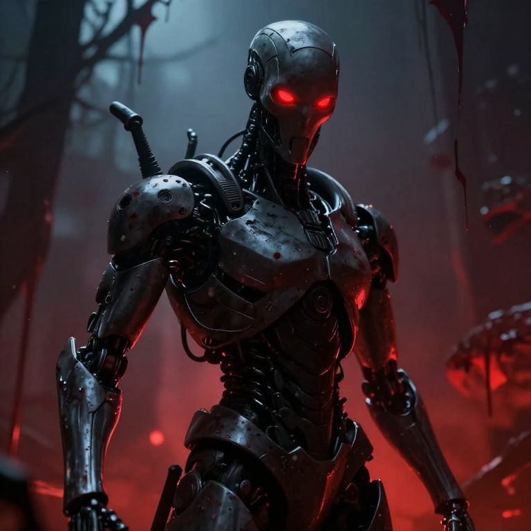 A cyborg reaper with glowing red eyes emerges from the shadows, its cold frame silhouetted against a blood-soaked, ominous backdrop, ) film, lots of fine detail, vibrant, artstation, aperture f/7, soft lighting, fashion photography, 8k wallpapers, ratio