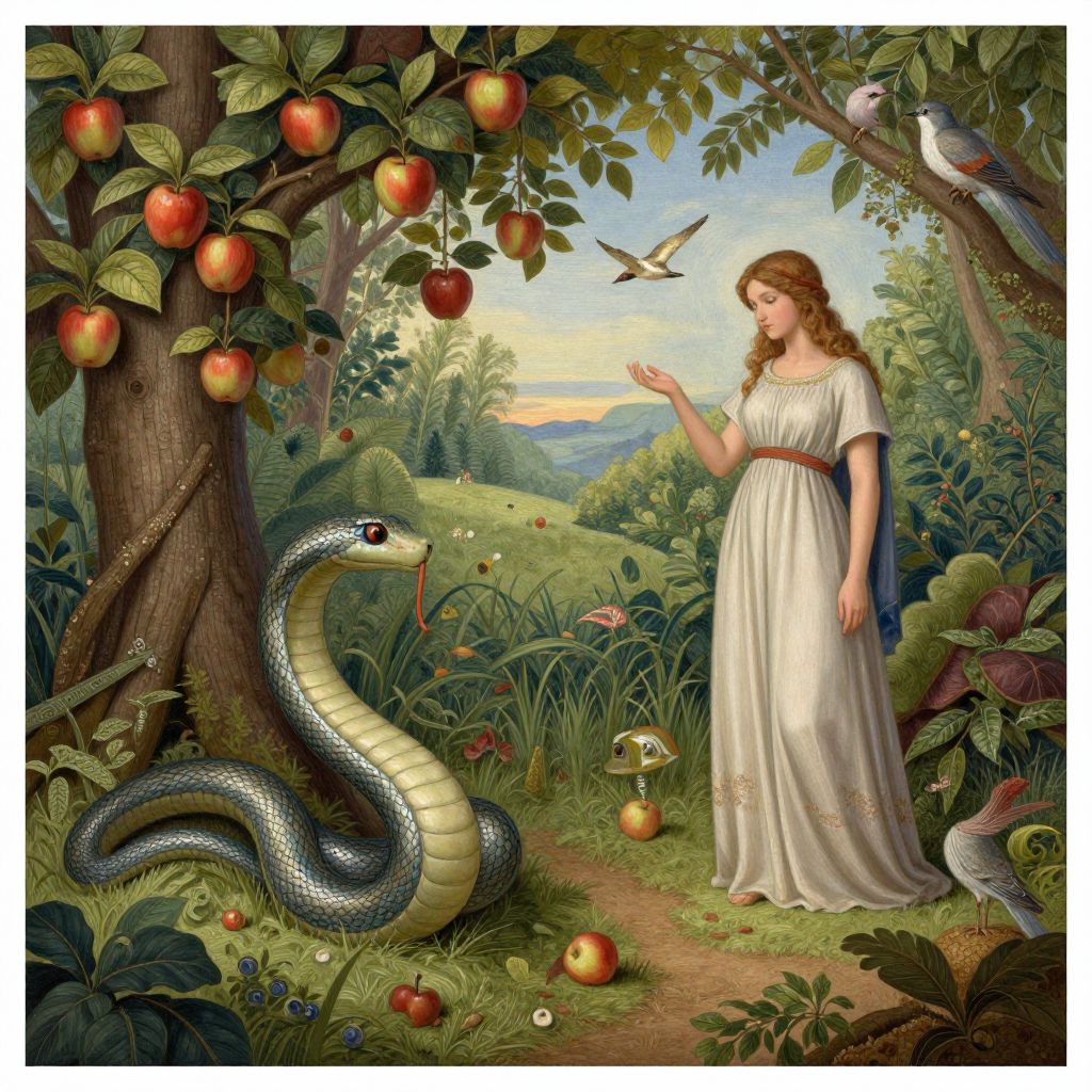A highly detailed, biblically inspired artwork depicting the Garden of Eden with a serpent, apples, and a woman surrounded by lush foliage and birds.