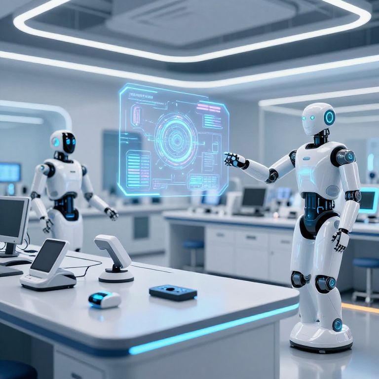 Modern:oswoqwdsrye= advanced technology laboratory, sleek robots and AI interfaces, glowing holograms floating in mid-air, futuristic gadgets on workbenches, glossy surfaces and bright LED lighting, high-tech and innovative environment