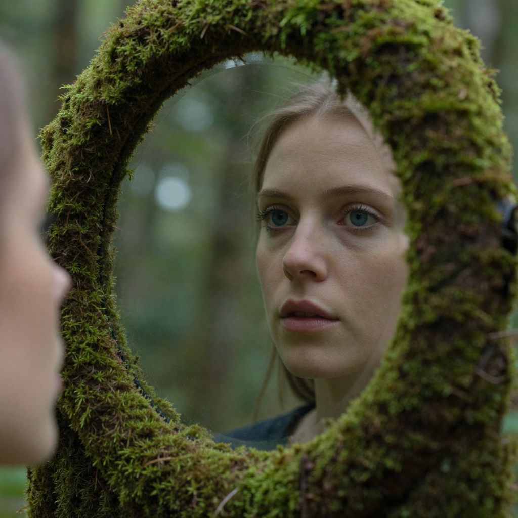 Moss-draped mirror reveals a hauntingly serene reflection of a woman's face, her piercing blue eyes gazing outward amidst a forested backdrop, blending seamlessly with the verdant surroundings.