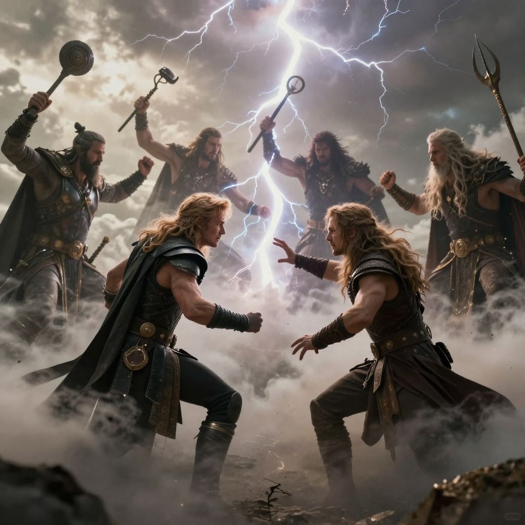 Zack Snyder style mythological battle, gods clashing amidst clouds and lightning, dynamic poses, cinematic depth of field, muted earth tones with bursts of electric light