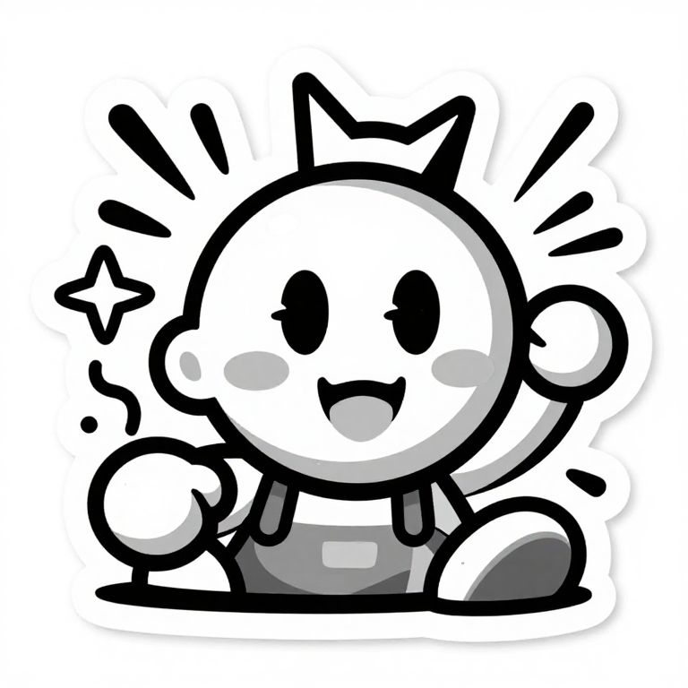 An abstract sticker with cartoon-style imagery featuring monochrome colors and dynamic, explosive patterns.