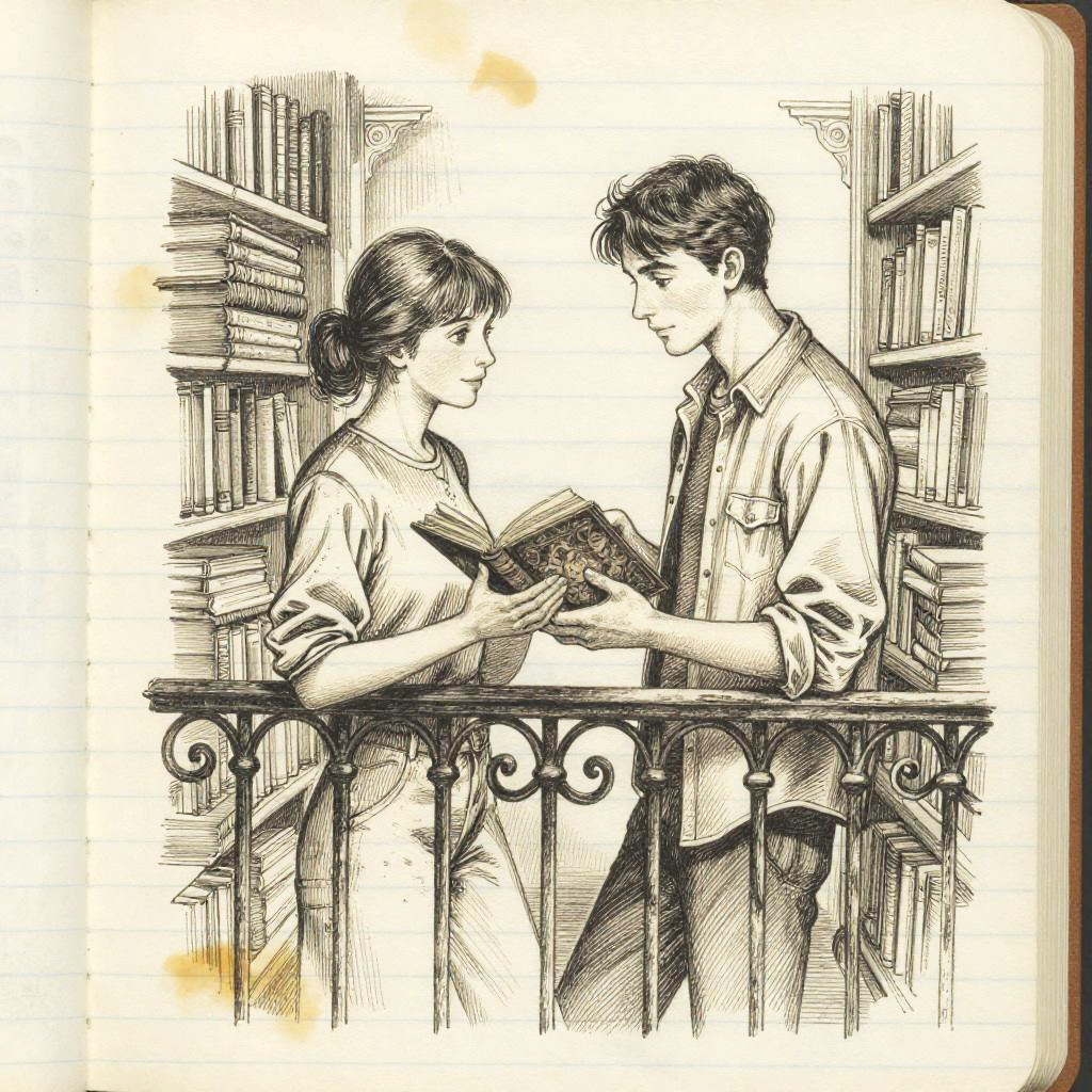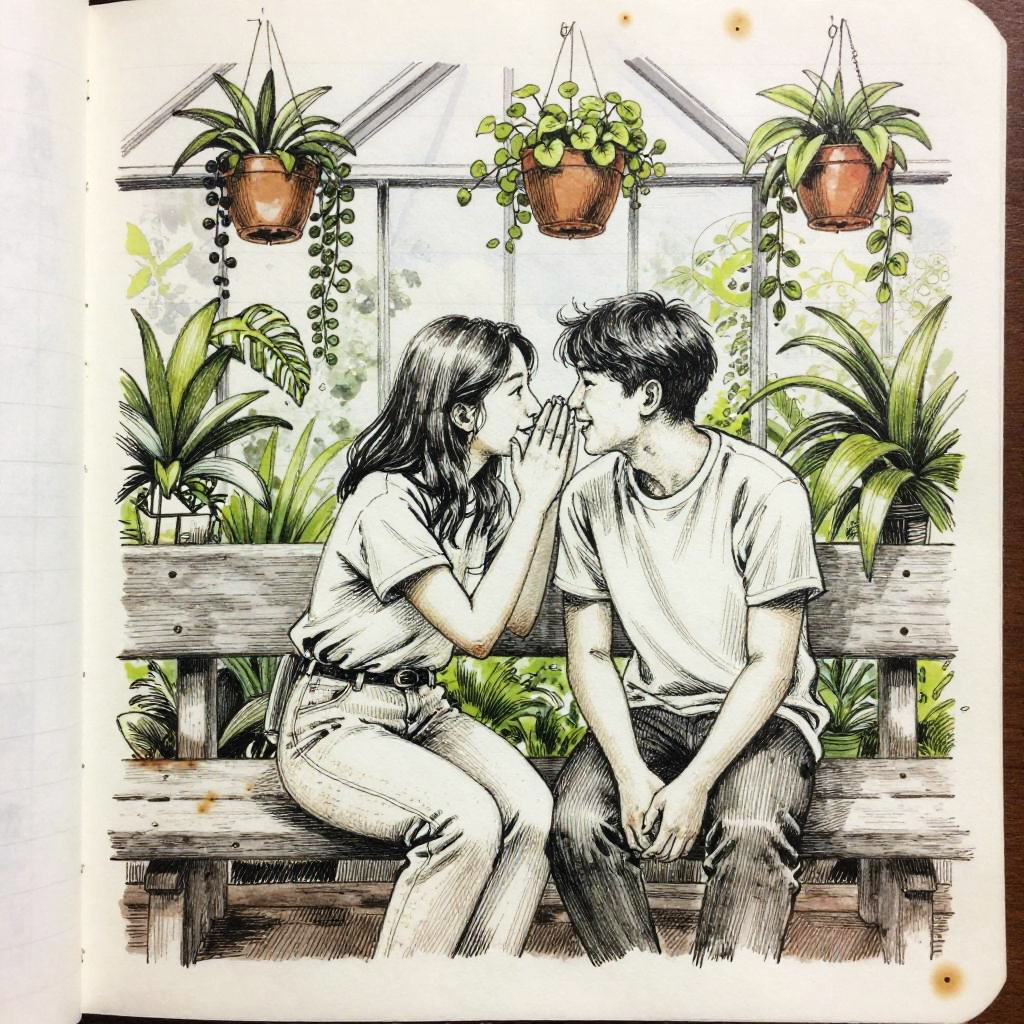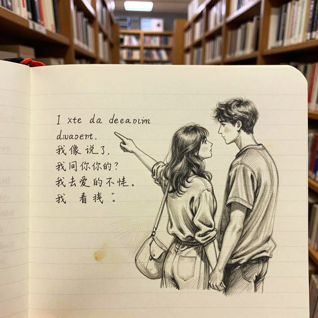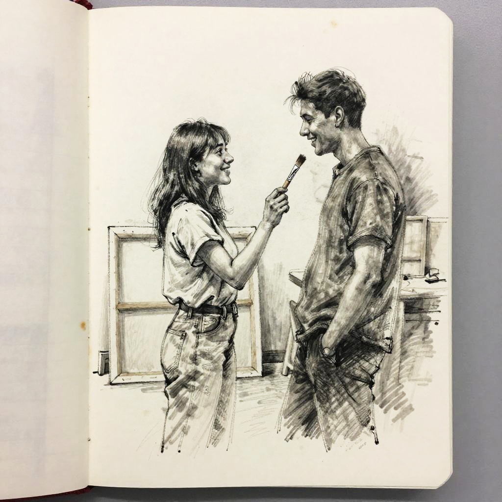 A romantic moment in a quiet train station platform bathed in soft morning mist, featuring a pair of friends sharing a casual hug before parting ways, with genuine smiles, drawn in fine graphite pencil rendering with gentle crosshatching and fluid linework, on lined notebook paper with faint ruling, margin scribbles, and coffee-ring stains, casual clothing, soft smudges, blurred background, intimate and tender mood, gentle gesture lines, candid, sincere, timeless
