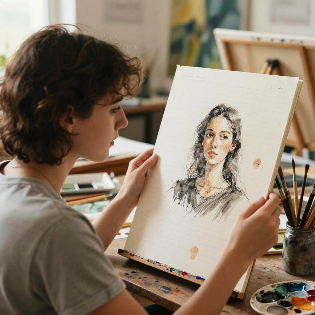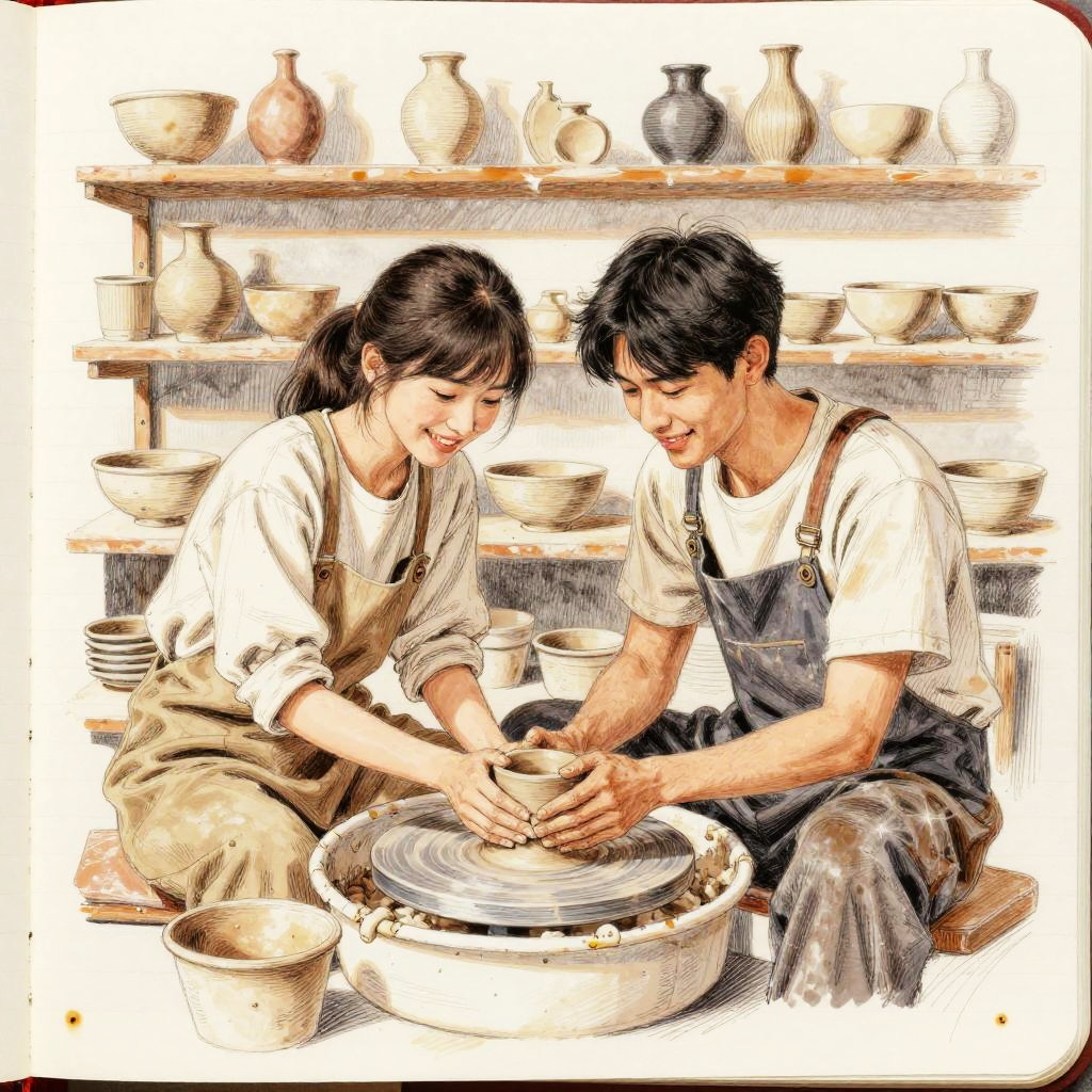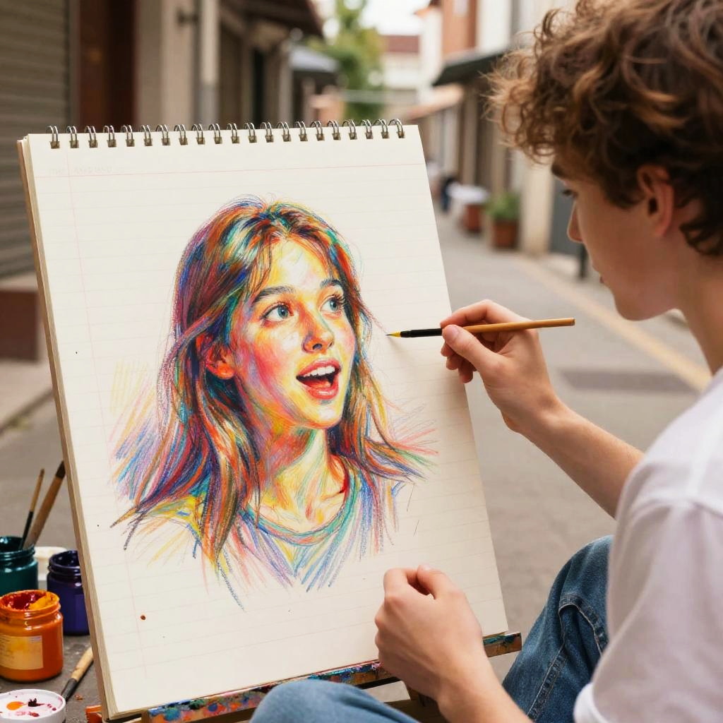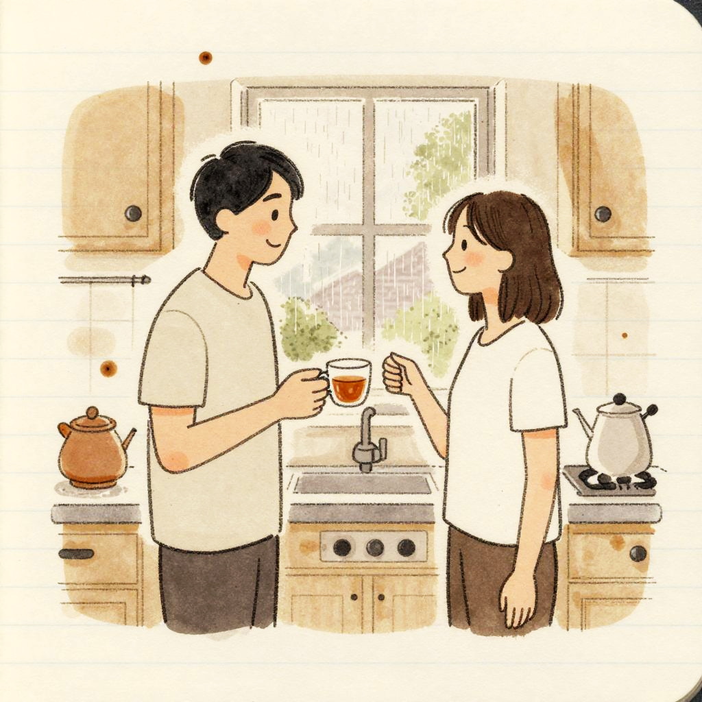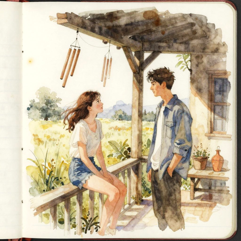 A romantic moment in a quiet train station platform bathed in soft morning mist, featuring a pair of friends sharing a casual hug before parting ways, with genuine smiles, drawn in fine graphite pencil rendering with gentle crosshatching and fluid linework, on lined notebook paper with faint ruling, margin scribbles, and coffee-ring stains, casual clothing, soft smudges, blurred background, intimate and tender mood, gentle gesture lines, candid, sincere, timeless