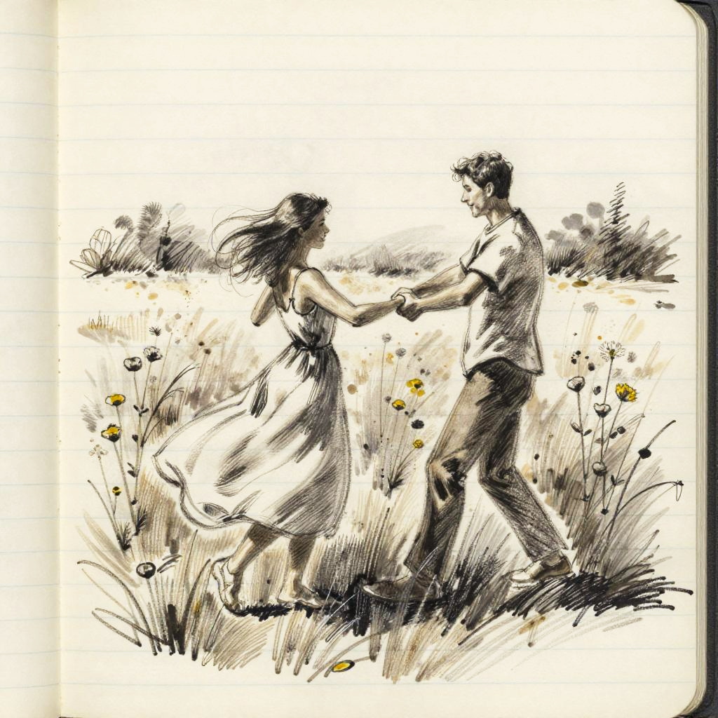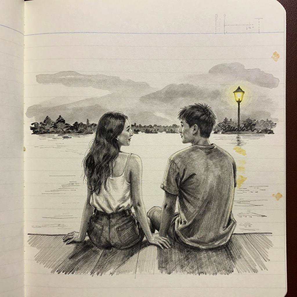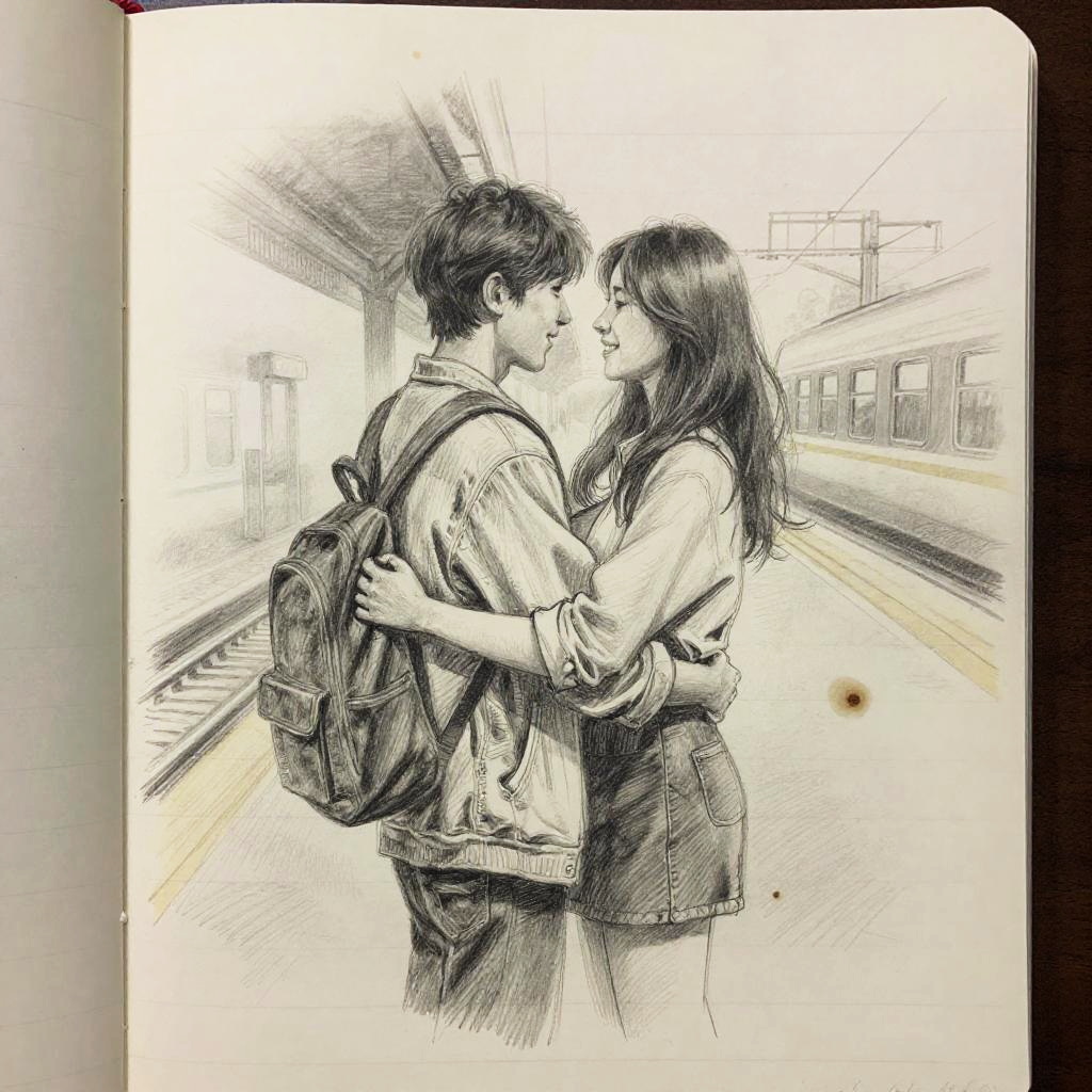 Graphite pencil drawing of a young couple sharing a casual, intimate hug on a quiet train station platform. The scene is rendered with fine crosshatching and fluid linework on lined notebook paper with coffee-ring stains. The young man wears casual clothing with a backpack, while the young woman is dressed in a skirt and blouse. Soft morning mist and a distant train create a serene and tender atmosphere.