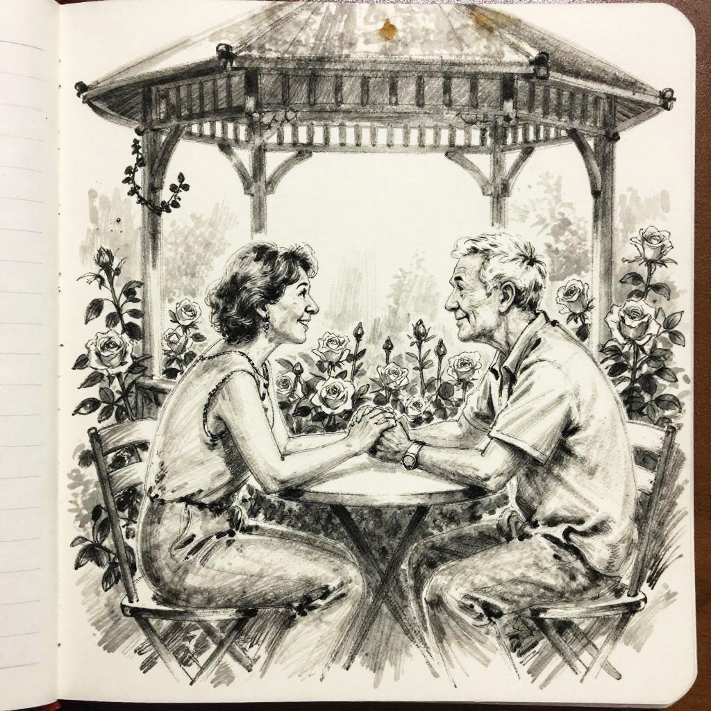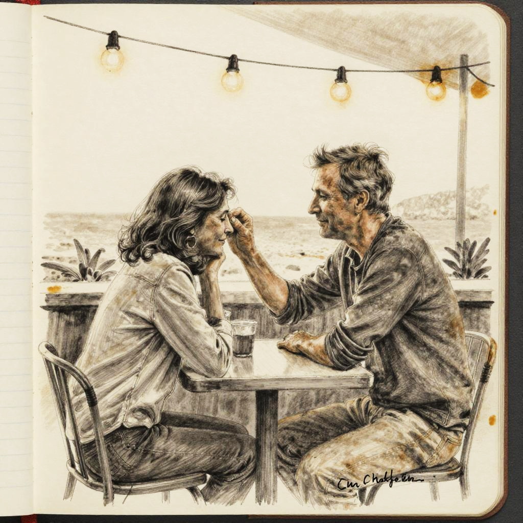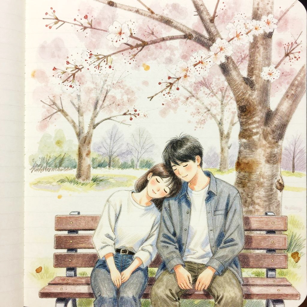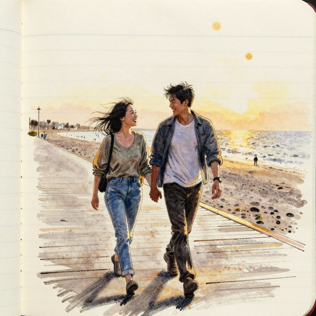 Graphite pencil drawing of a young couple sharing a casual, intimate hug on a quiet train station platform. The scene is rendered with fine crosshatching and fluid linework on lined notebook paper with coffee-ring stains. The young man wears casual clothing with a backpack, while the young woman is dressed in a skirt and blouse. Soft morning mist and a distant train create a serene and tender atmosphere.