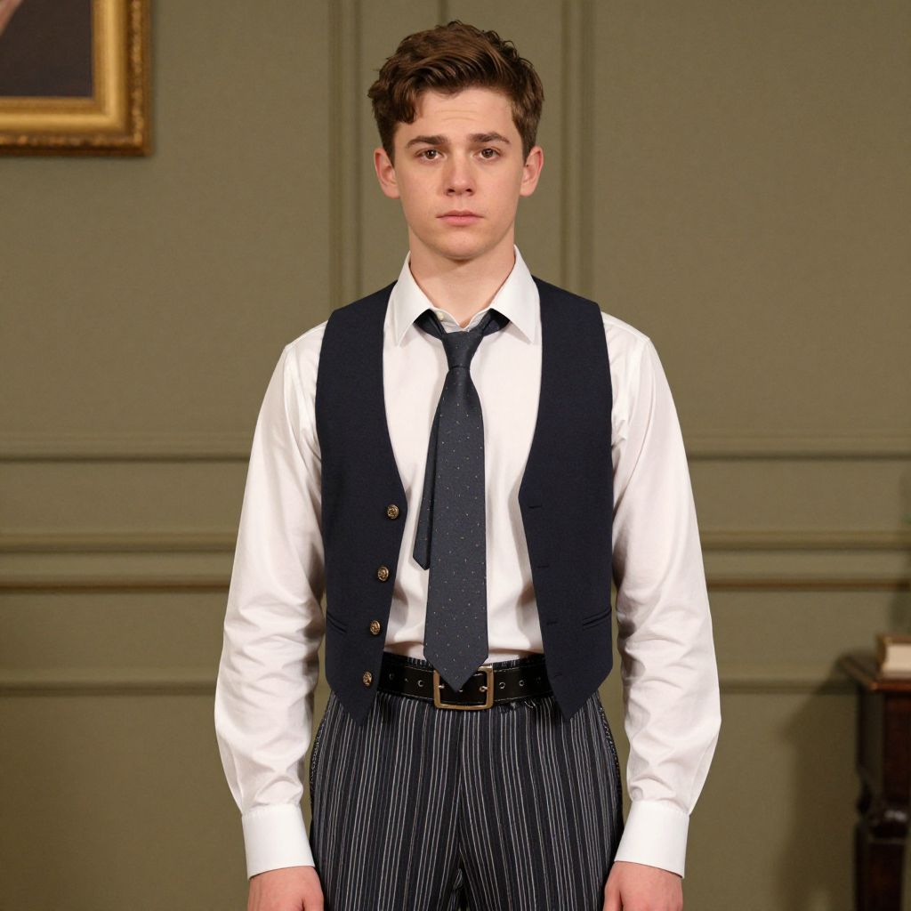 British costume, solo, male focus, 1boy, necktie, shirt, vest, looking at viewer, realistic, white shirt, pants, striped pants, striped clothes, indoors, collared shirt, belt, brown hair, closed mouth